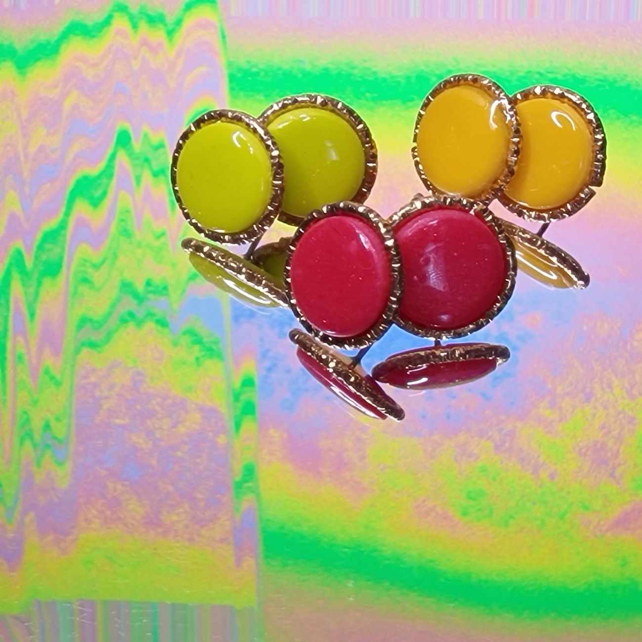 Resin coated polymer clay, gold plated accents and stainless steel studs. (30mm length)